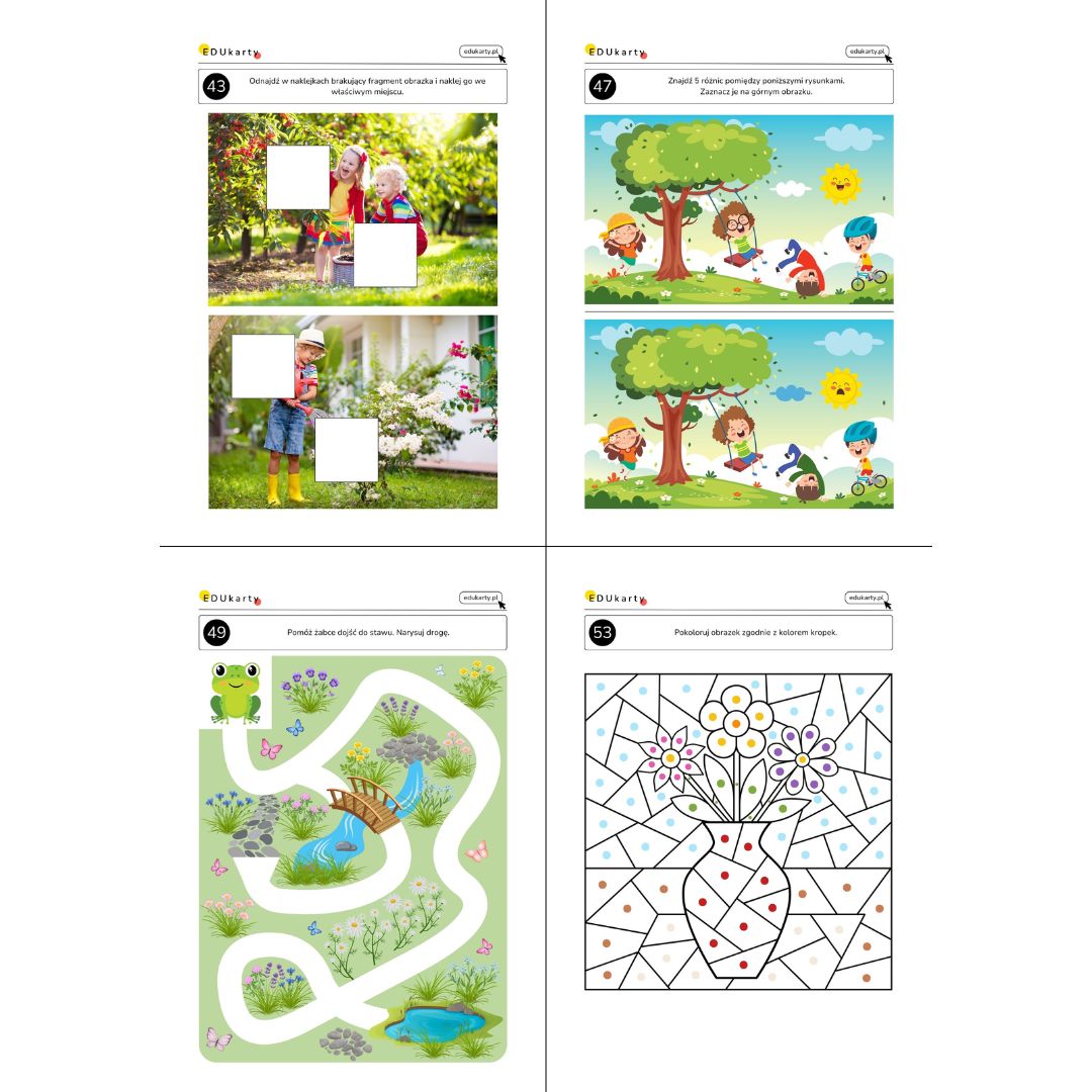 55 kart pracy, w tym: labirynty, rysowanie po śladzie, kolorowanie według kodu, liczenie, kodowanie, szukanie różnic oraz puzzle.